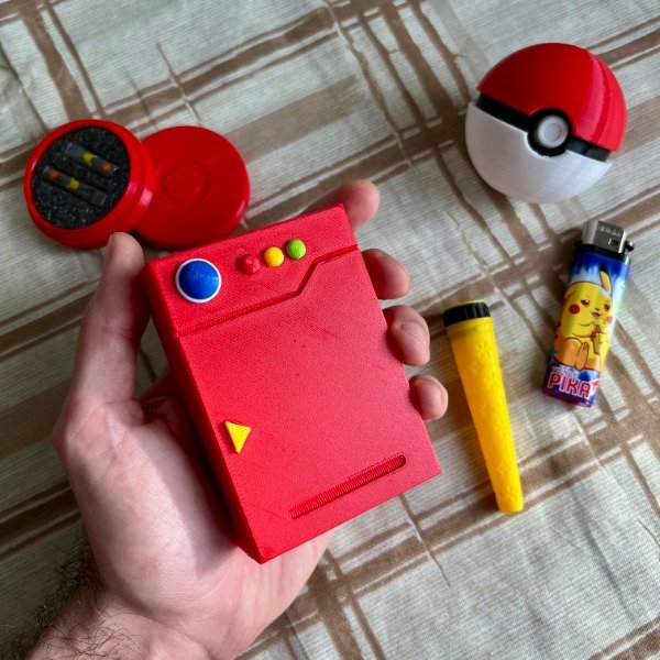 Nuevo y mejorado modelo de nustra pokedex: ahora con una bisagra "print in place" para mayor durabilidad y mejor estetica, tambien cuenta con mas espacio de guardado, enganche para papelillos y compartimiento para guardar tus filtros o encendedor!